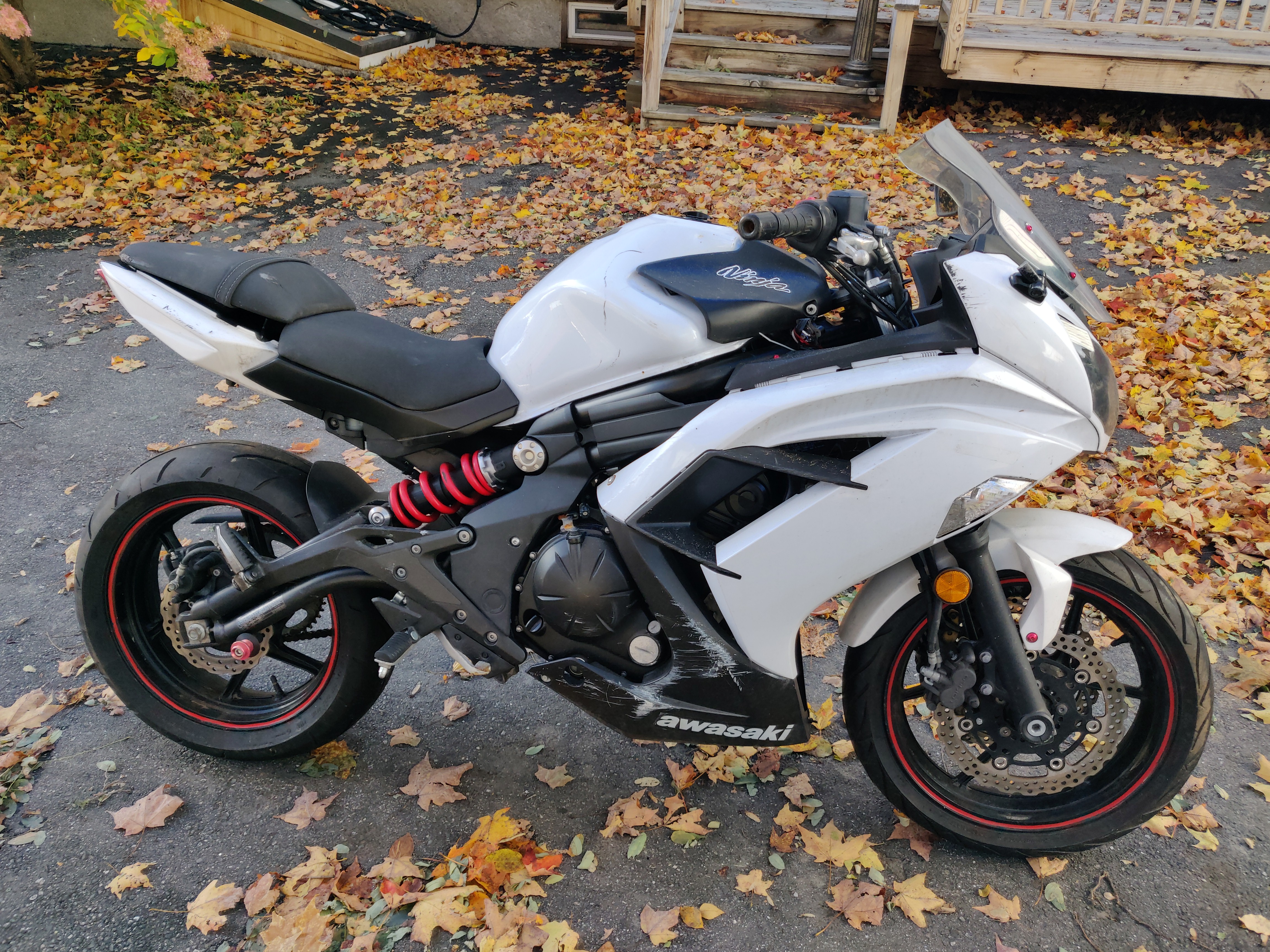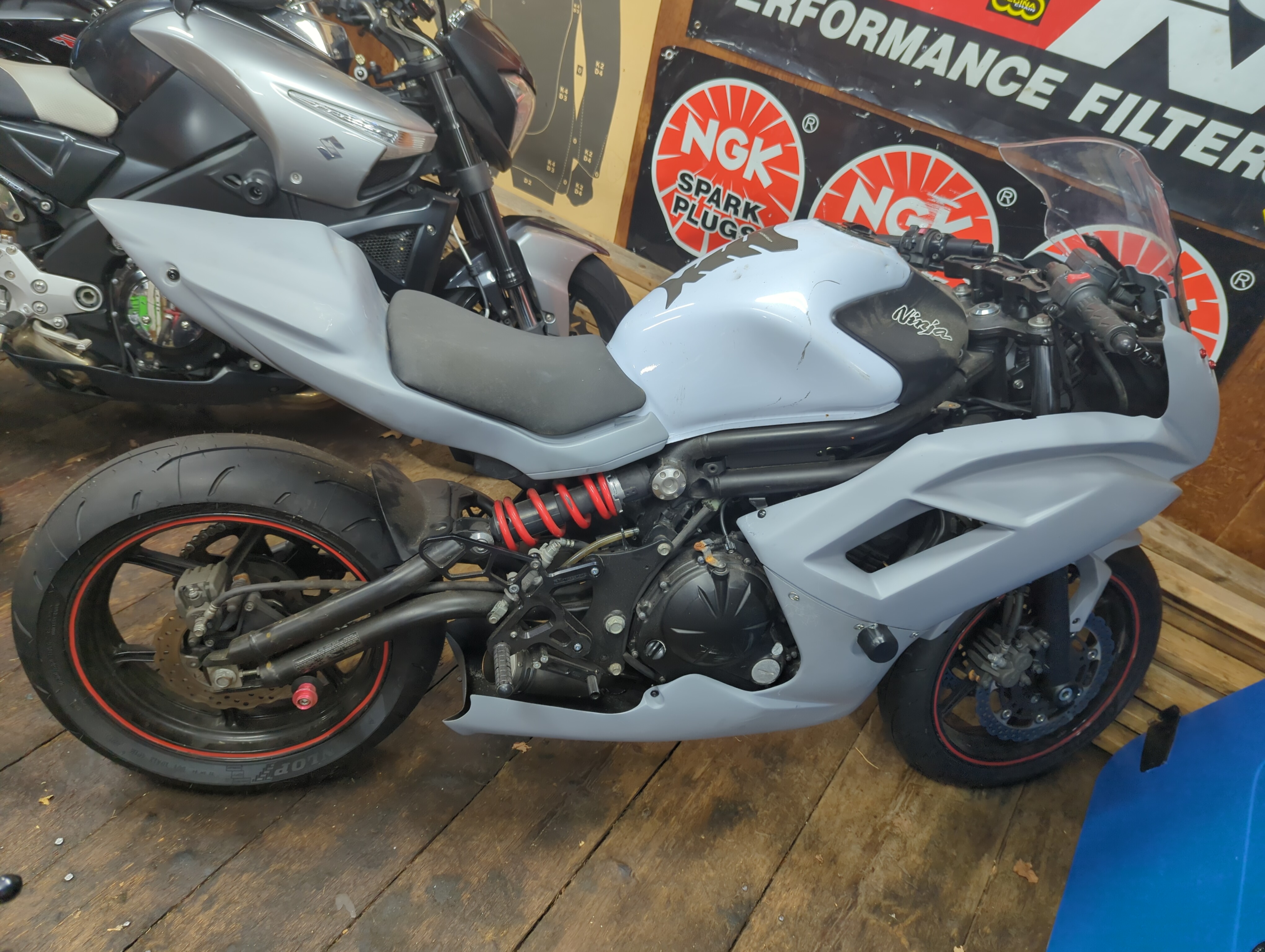 We picked up a 2013 Kawasaki Ninja 650 late last year for a reasonable price. It had a little damage, as these lower-cost bikes generally do. It’s a great platform for a track day bike though, as it’s the same bike that Penguin Racing uses as part of its rental fleet. There are a ton of reasonably-priced add-on parts available from the various vendors that we’re a dealer for, like Woodcraft, Vortex, and others.