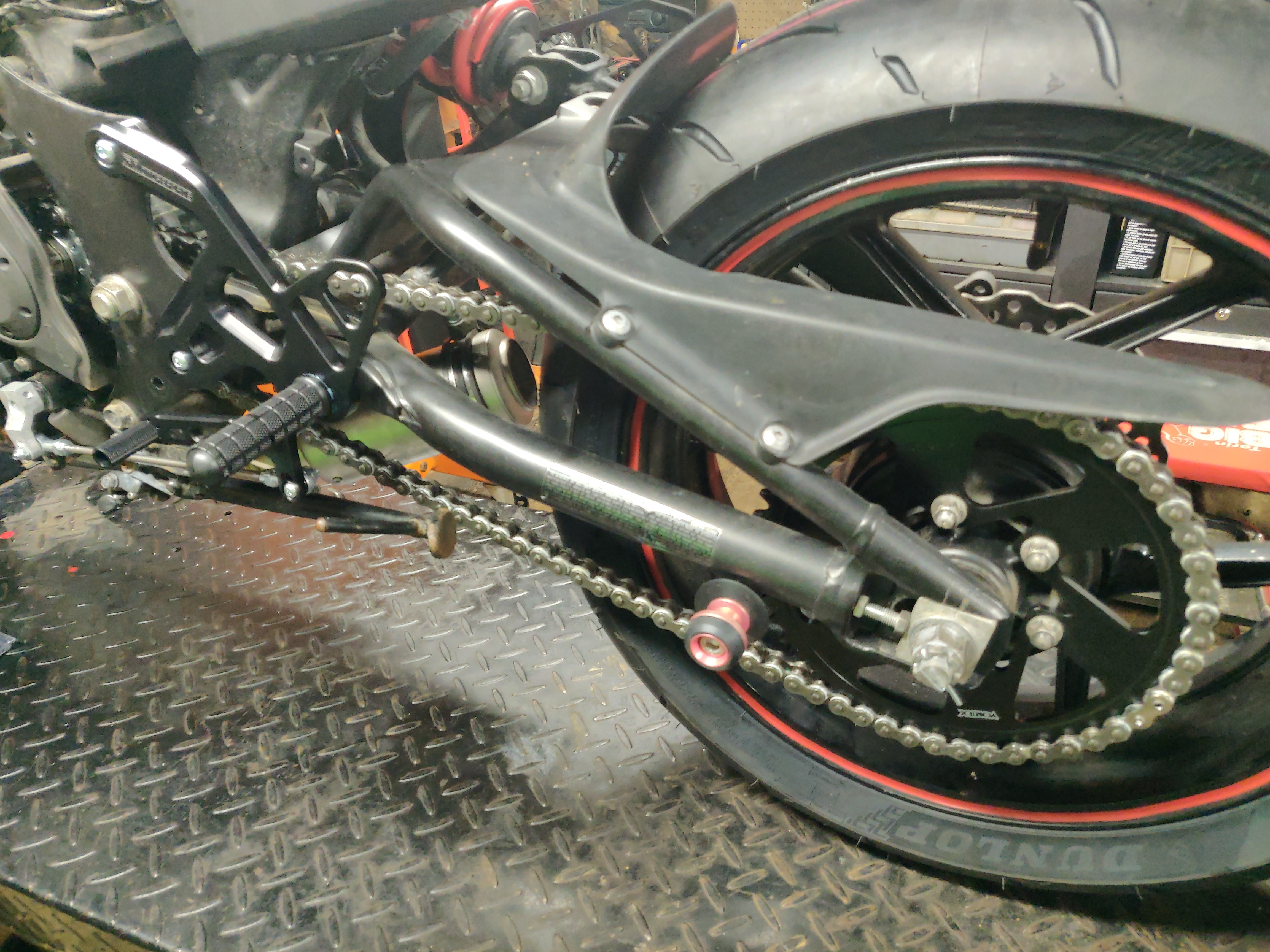 All of the Woodcraft parts are installed. They included decent instructions which were easy to follow. All the stock parts they replaced will be put up for sale or just tossed since some of them had previous damage. The rear tire and new chain and sprockets are installed. The JT chain actually came with both a rivet link and a clip-on link. We opted for the rivet and will keep the clip-on for a spare.